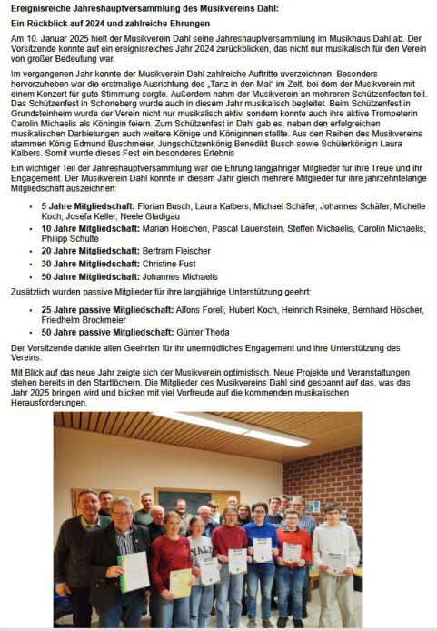 Bei der diesjährigen Jahreshauptversammlung begrüßte der 1. Vorsitzende Stefan Buschmeier knapp 80 Mitgliederinnen und Mitglieder des Dahler Musikvereins und blickte auf ein ereignisreiches Musikjahr 2012 zurück. Neben dem musikalischen Höhepunkt des zurückliegenden Jahres, dem Frühlingskonzert, das die Dahler Sporthalle bis zum letzten Platz füllte, gestaltete das Blasorchester den musikalischen Rahmen vieler Dahler Veranstaltungen der unterschiedlichsten Art. Aber auch über die Grenzen des eigenen Ortes hinaus präsentierten sich die Dahler Musikanten beispielsweise in Grundsteinheim, Herbram, Paderborn, Schloss-Neuhaus, Hausen (Brandenburg) sowohl mit volkstümlichen wie auch rockigen und popigen Klängen.